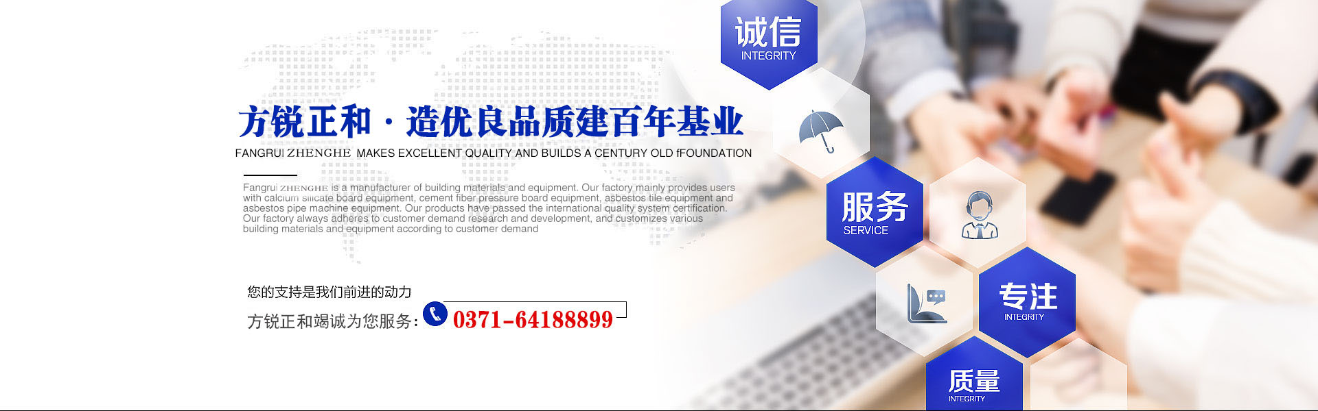 鄭州方銳正和機械制造有限公司在硅酸鈣板設備水泥纖維壓力板設備石棉瓦設備石棉管設備等新型建材領域有豐富的經驗成熟的工藝,公司位于河南省鄭州市鞏義市芝田鎮,多年來,公司匯集了一大批銳意進取并代表著行業水平的管理人員。公司非常重視技術交流與合作,引進了發達的好技術和工藝,在技術本土化的基礎上,我們一直在理性的探索,不斷創新,開發適合客戶需求的新產品。公司秉承以“以人才為根本,以市場為導向,以科技為基礎,以產業為標準、以質量為保證、以世界為目標。”的經營方針力求的設備服務于社會而努力。我公司經過多年不斷的努力,發展壯大,成為國內設備廠家。